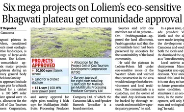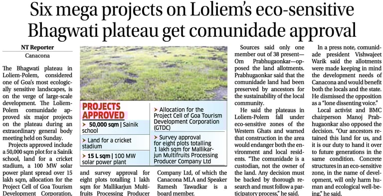 Source : The Navhind Times, Six Mega Projects on Loliem's eco-sensitive Bhagwati plateau get comunidade approval, 8 July 2025. https://epaper.navhindtimes.in/PageImages/PDF/2025/07/08/0807025-md-ga-05.pdf?utm_source=chatgpt.com